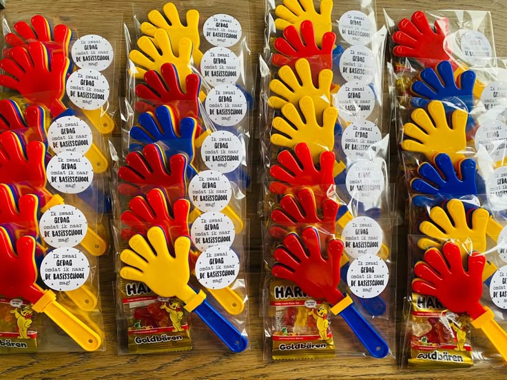 Regenboogtraktaties, klapperhand traktaties, popcornbakjes en traktaties met naam of kaartje.