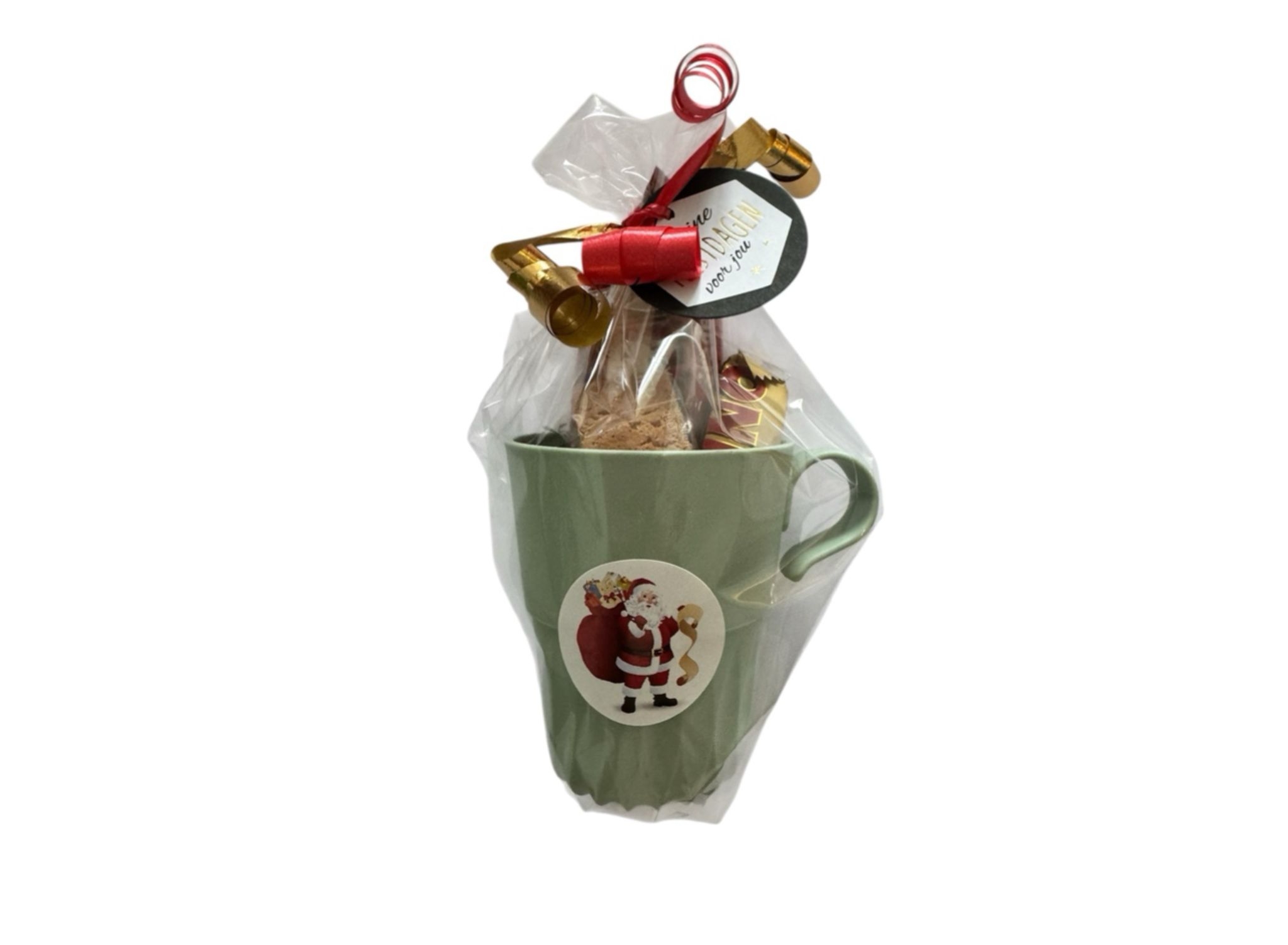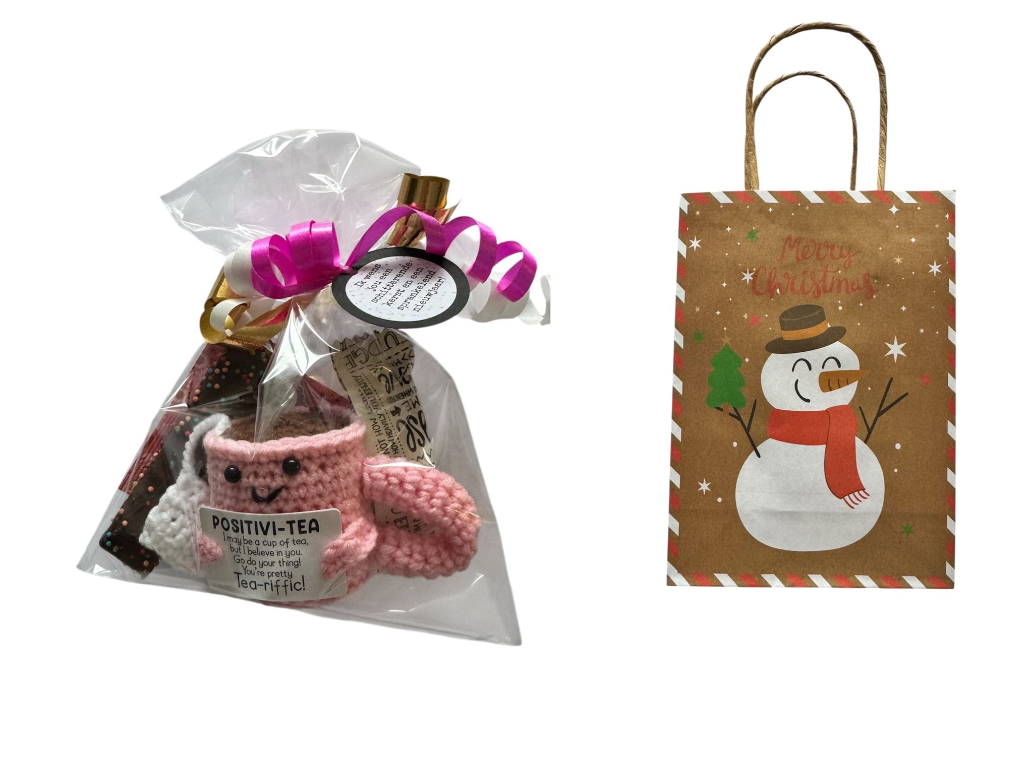 Verras iemand met dit sfeervolle kerstcadeautje! Een feestelijk zakje gevuld met heerlijke Maltesers en een zakje Merry X-Mas thee, mooi verpakt in een bakje in een blokbodemzak. Afgewerkt met een schattige kersthanger in de vorm van een huisje en een label met de tekst “Fijne feestdagen en een gelukkig nieuwjaar”.