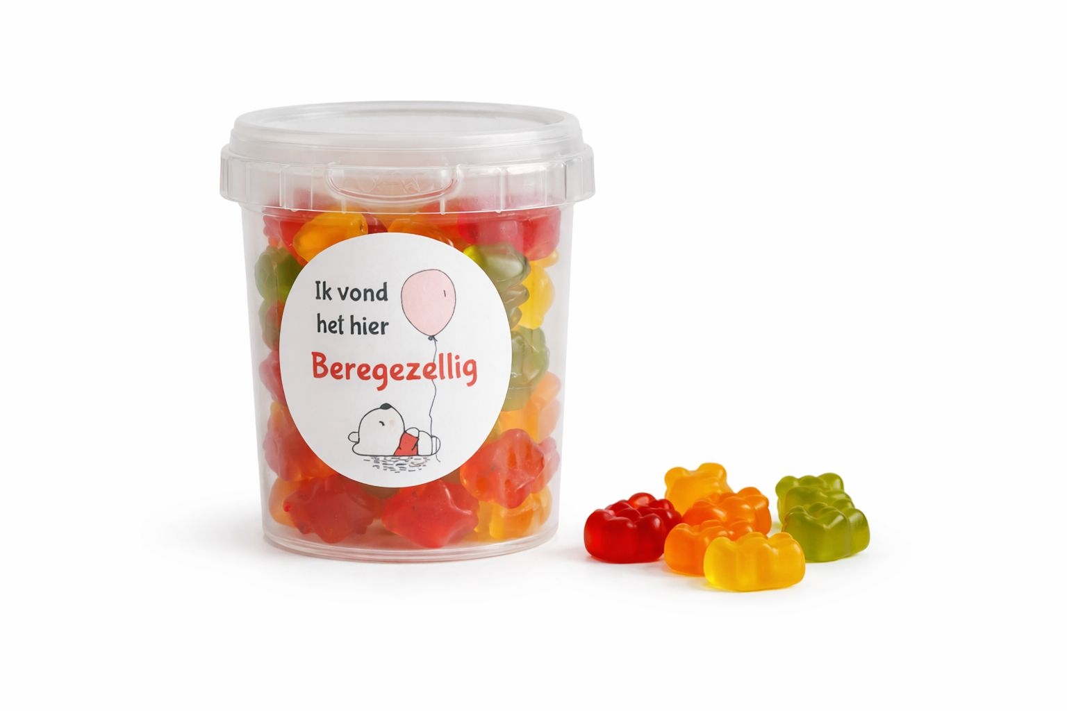 - 100 gram snoep beren in afsluitbaar verzegeld bakje met stickers: ik vond het hier beregezellig