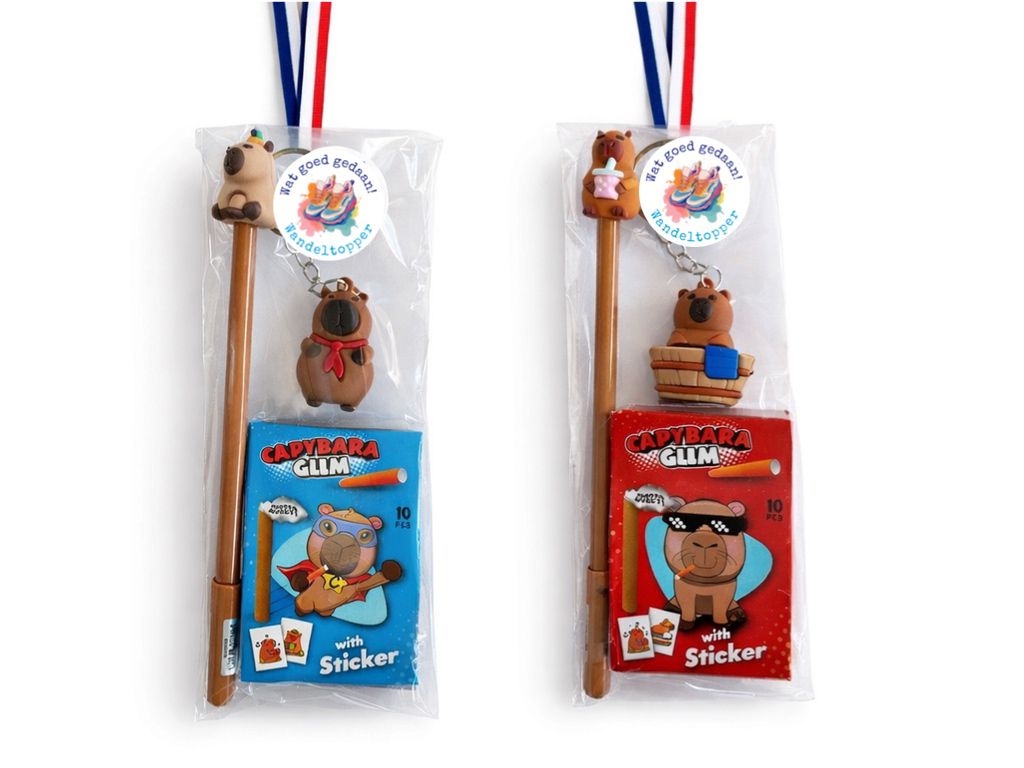 Vier de prestatie van jouw echte doorzetter met dit vrolijke Vierdaagse Kampioen cadeau met capybara-thema. Dit setje bestaat uit een capybara sleutelhanger, capybara kauwgum en een capybara balpen, feestelijk verpakt in een transparant zakje met lint en een sticker Vierdaagse Kampioen.