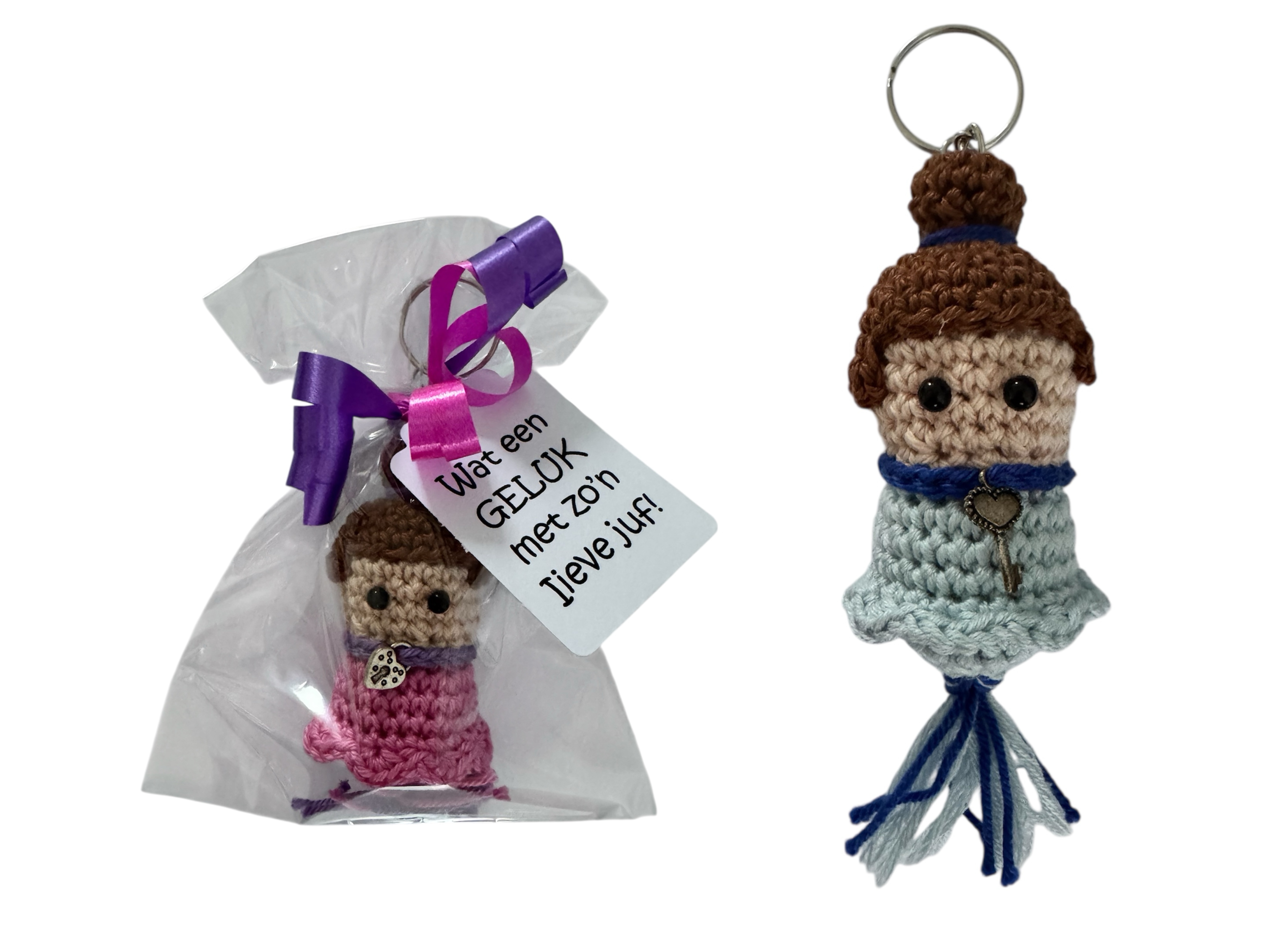 - Lief gehaakt gelukspoppetje in de vorm van een juffrouw met bedeltje als ketting, kan gebruikt worden als sleutelhanger. Mooi verpakt in cellofaan met lint en label: Wat een GELUK met zo'n lieve juf