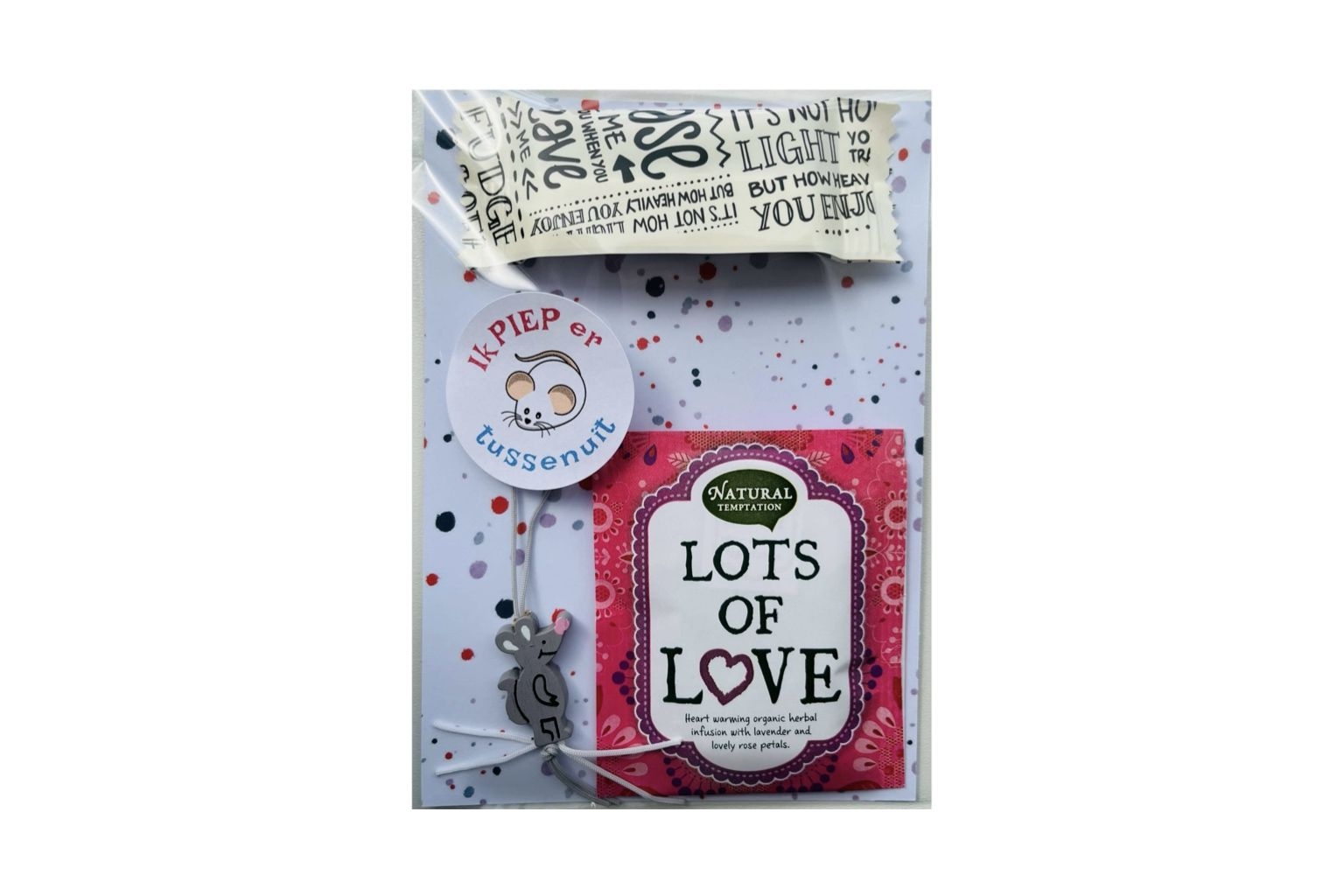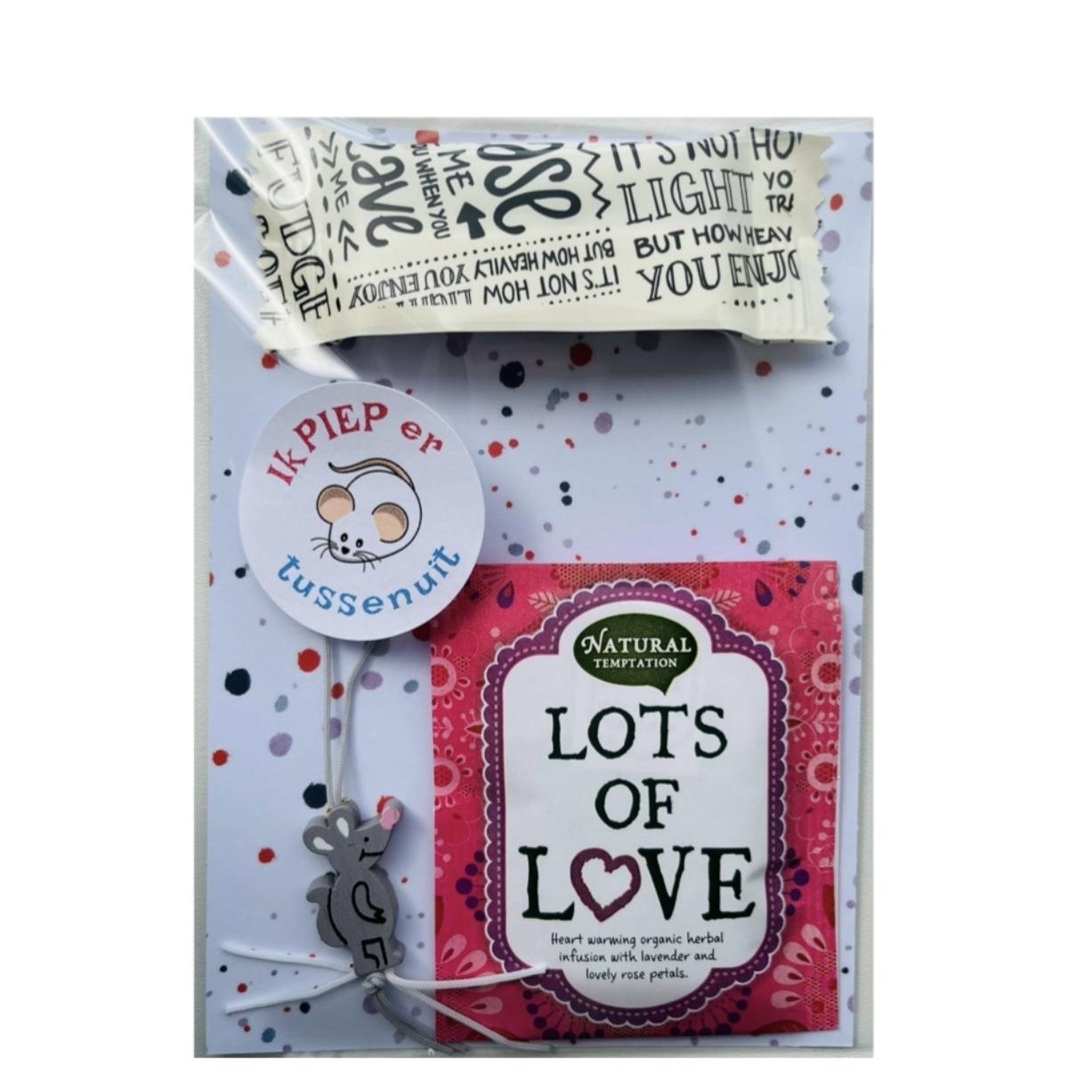 - leuk setje met lots of love thee, Johnny Doodle fudge, geluks muisje op kaart met sticker Ik piep er tussenuit