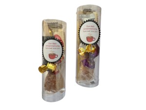 - Transparante koker gevuld met: zakje DE koffie, houten lepel. amandel koekje, fudge, nougat, toblerone met sticker een klein verwenmomentje speciaal voor jou