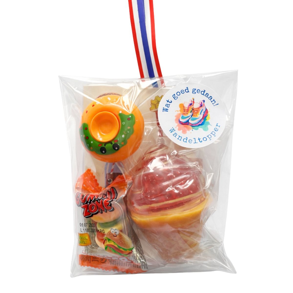 Het cadeautje wordt feestelijk verpakt en voorzien van een lint, zodat kinderen het gemakkelijk om hun nek kunnen hangen tijdens de Vierdaagse. Een leuke en smakelijke verrassing na het wandelen!