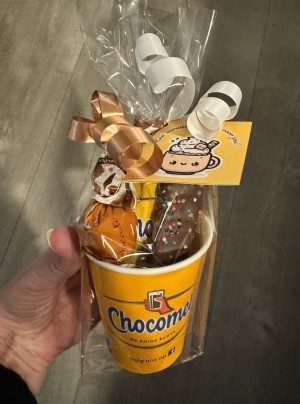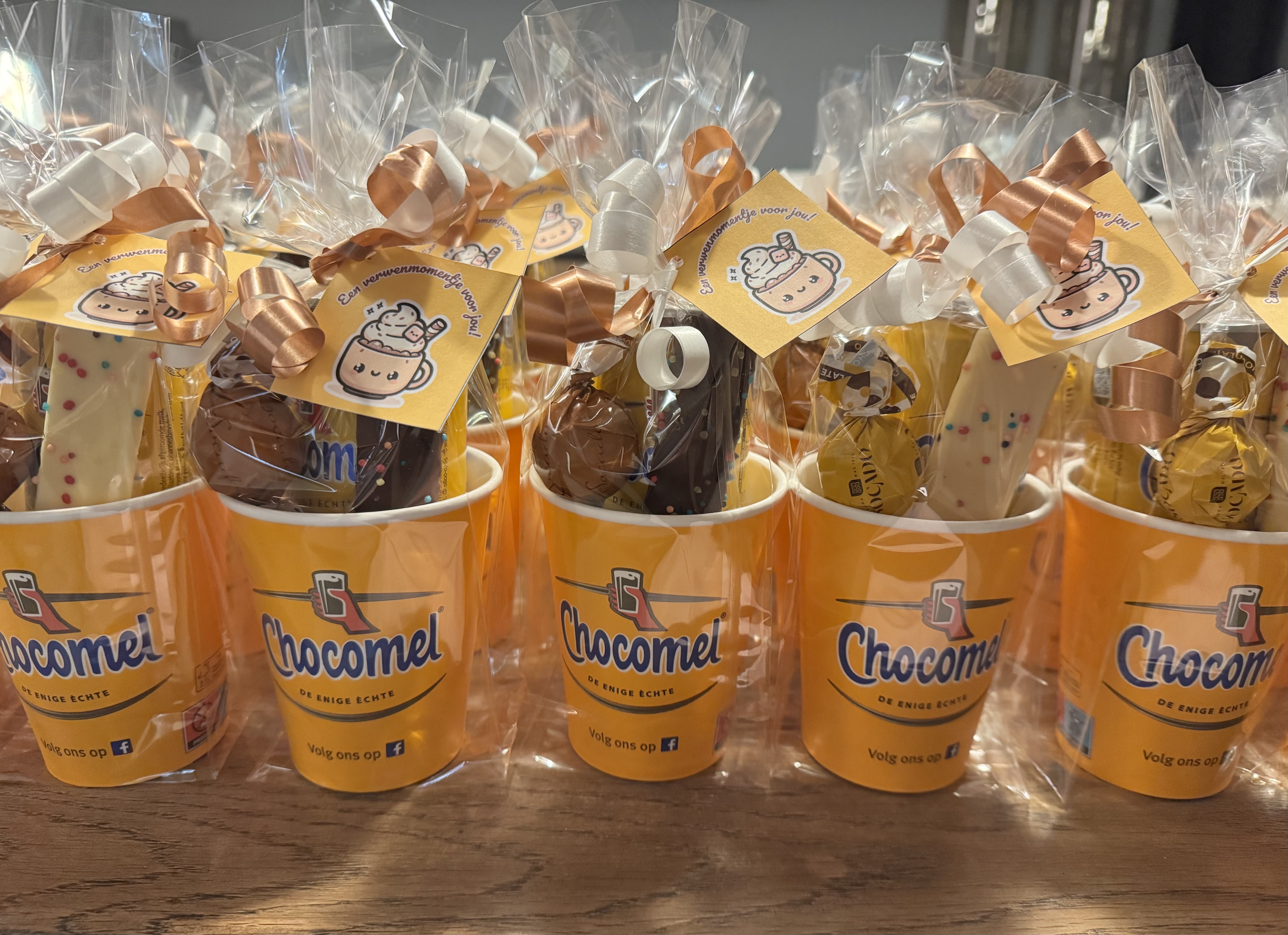 Bestaat uit beker chocomel (karton), blikje chocomel 0,25 cl, bonbon en chocolade spekje met kaartje: een verwen momentje voor jou!