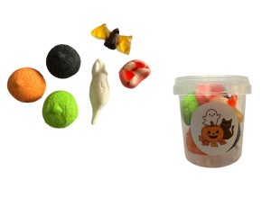 Je krijgt het volgende geleverd: spekbol zwart, oranje en groen, muis, vleermuis en dracula gebit, verzegelbaar transparant bakje + deksel, 2 stickers