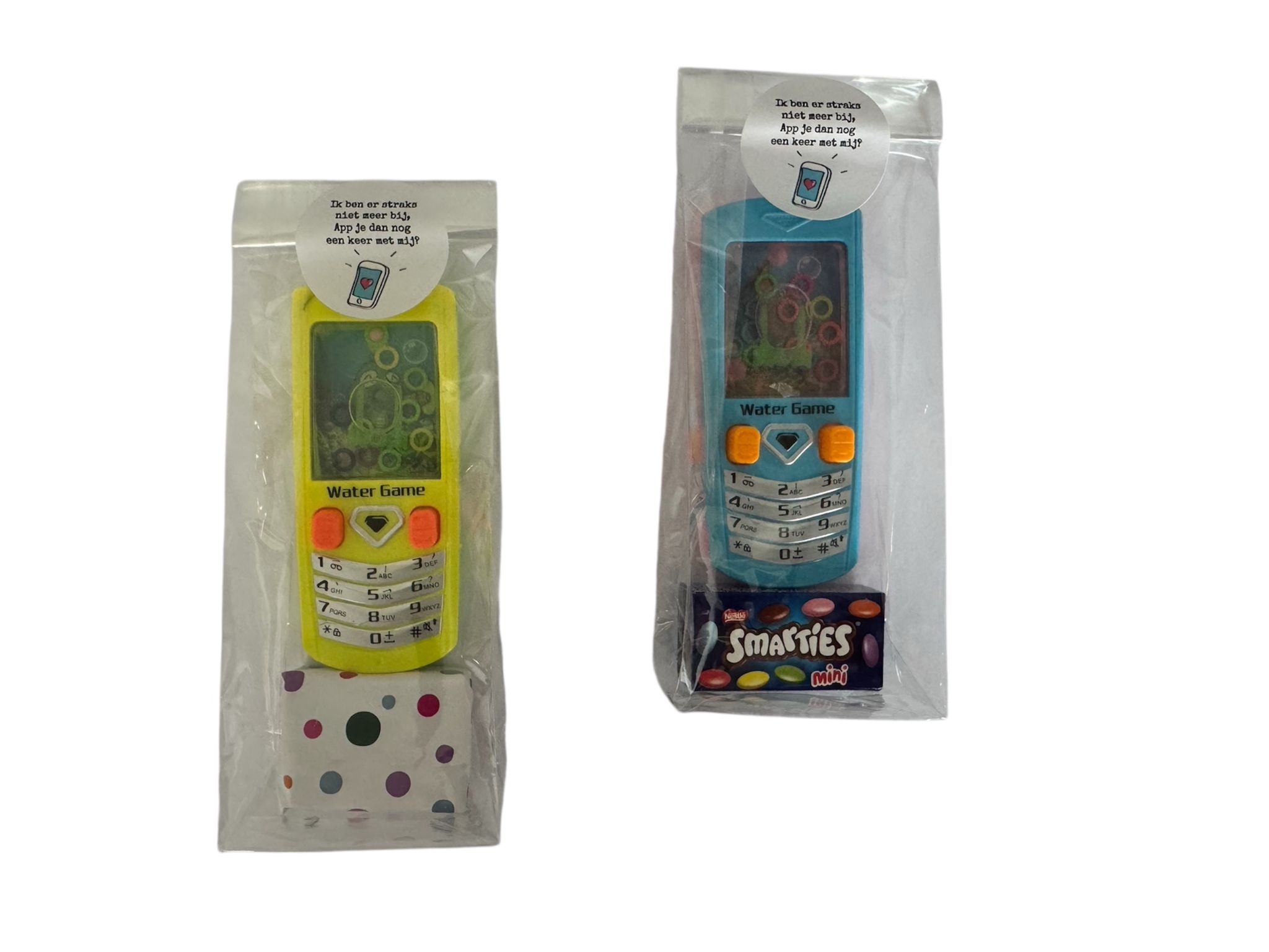Een superleuke afscheidstraktatie voor school! Deze traktatie bestaat uit een waterspelletje in de vorm van een mobiel / gsm, met een snoepje naar keuze (bijv. spekje of snoepketting) in een blokbodemzakje. Op het zakje zit een vrolijke sticker met de tekst: “Ik ben er straks niet meer bij, app je dan nog een keer met mij?”.