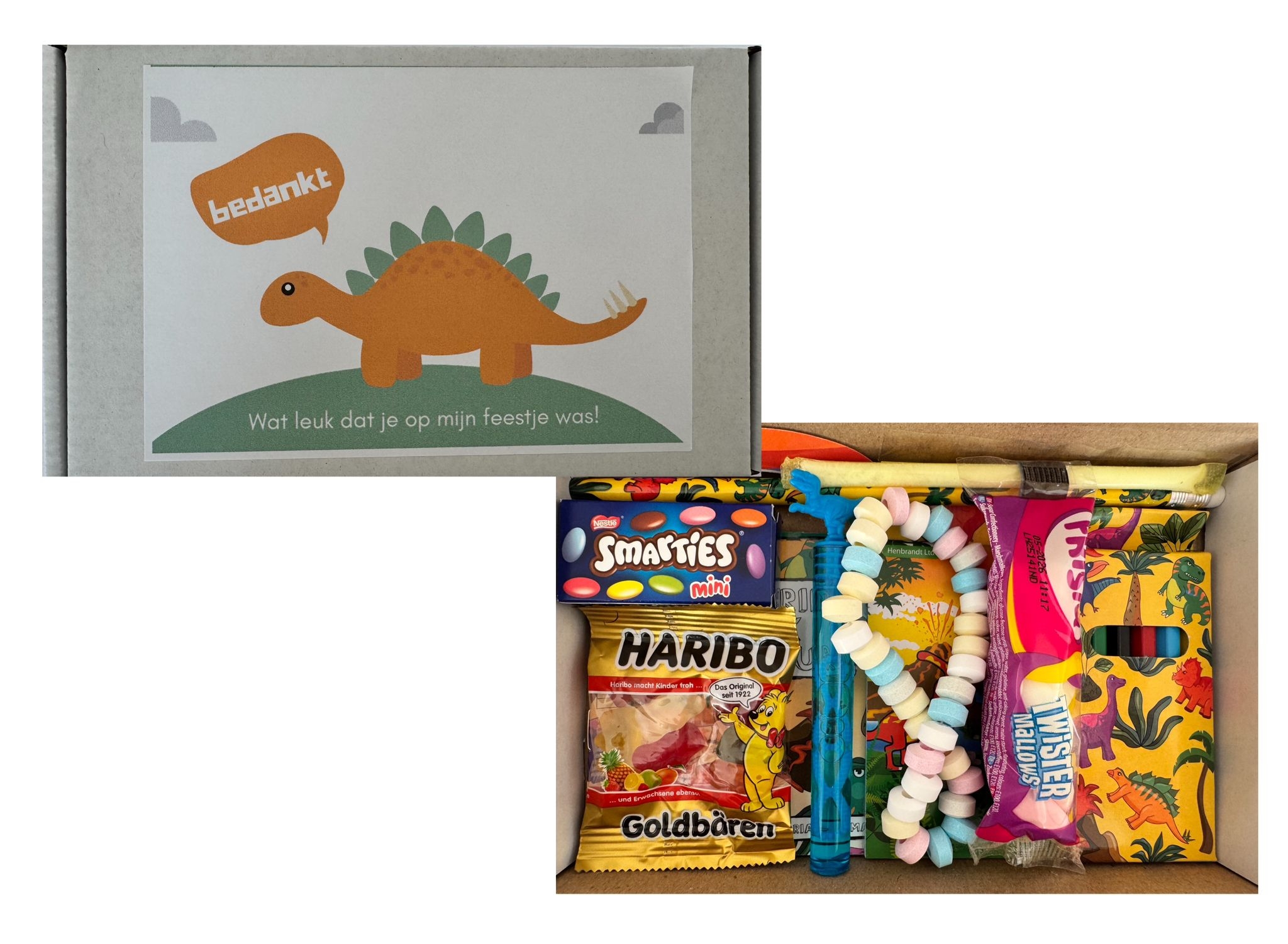 aan de voorkant zit een sticker met de tekst: Bedankt dat je op mijn feestje was in dino Variant
