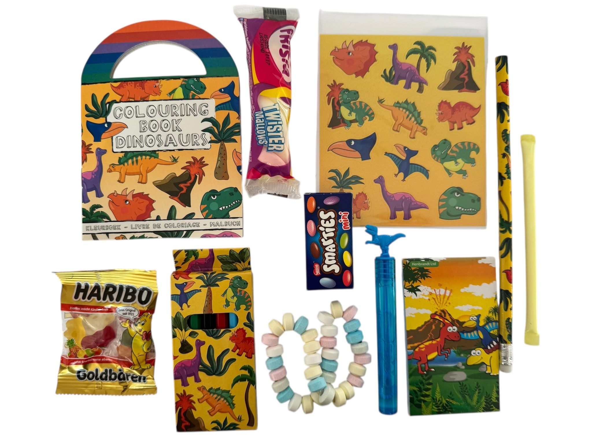 Het volgende zit erin: Stickervel Dino, kleurboekje Dino, kleurpotloodjes, notitieboekje, potlood, bellenblaas staafje, goudberen, kabelspek, poederstaafje, snoepketting, smarties