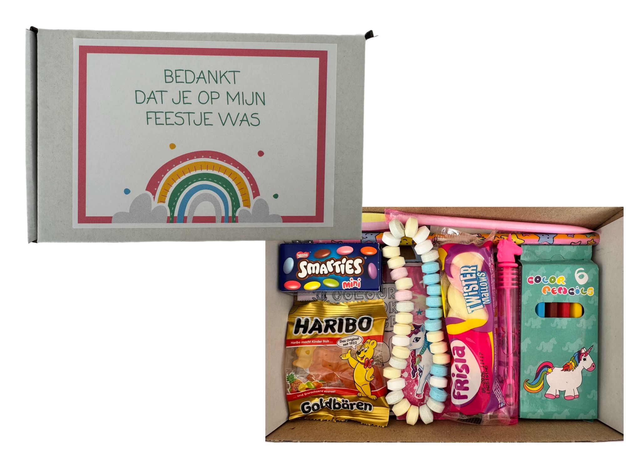 aan de voorkant zit een sticker met de tekst: Bedankt dat je op mijn feestje was in Eenhoorn / Regenboog Variant