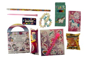 Het volgende zit erin: Stickervel, kleurboekje, kleurpotloodjes, notitieboekje, potlood, bellenblaas staafje, goudberen, kabelspek, poederstaafje, snoepketting, smarties