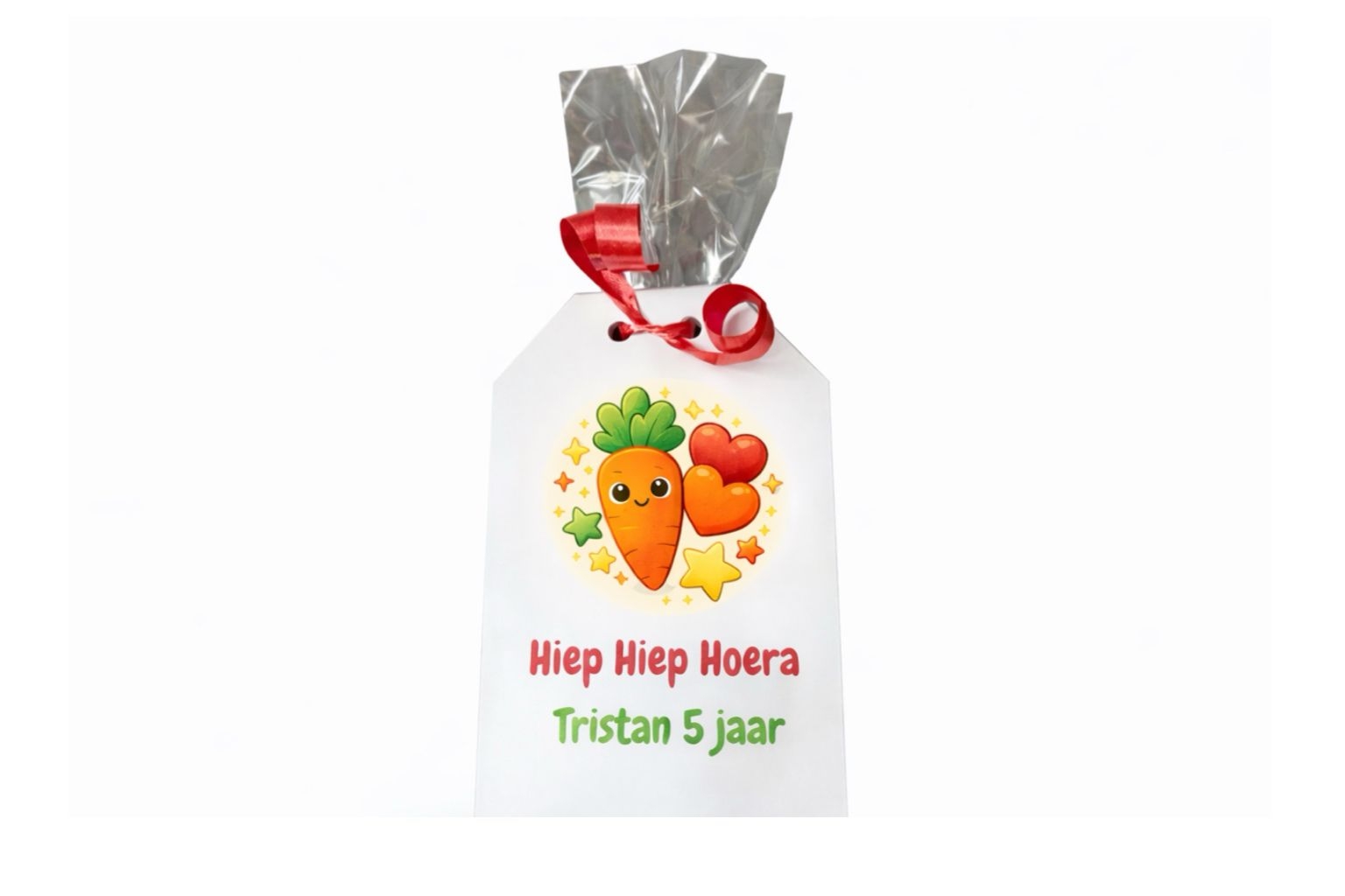 - Je ontvangt: 1 gepersonaliseerd label op 160 grams papier, 1 blokbodemzak en 1 lintje.