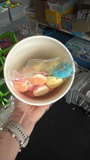 Er is een keuzelijst om een snoepmix van 250 gram eraan toe te voegen, zie foto 2 hoe het dan gevuld is