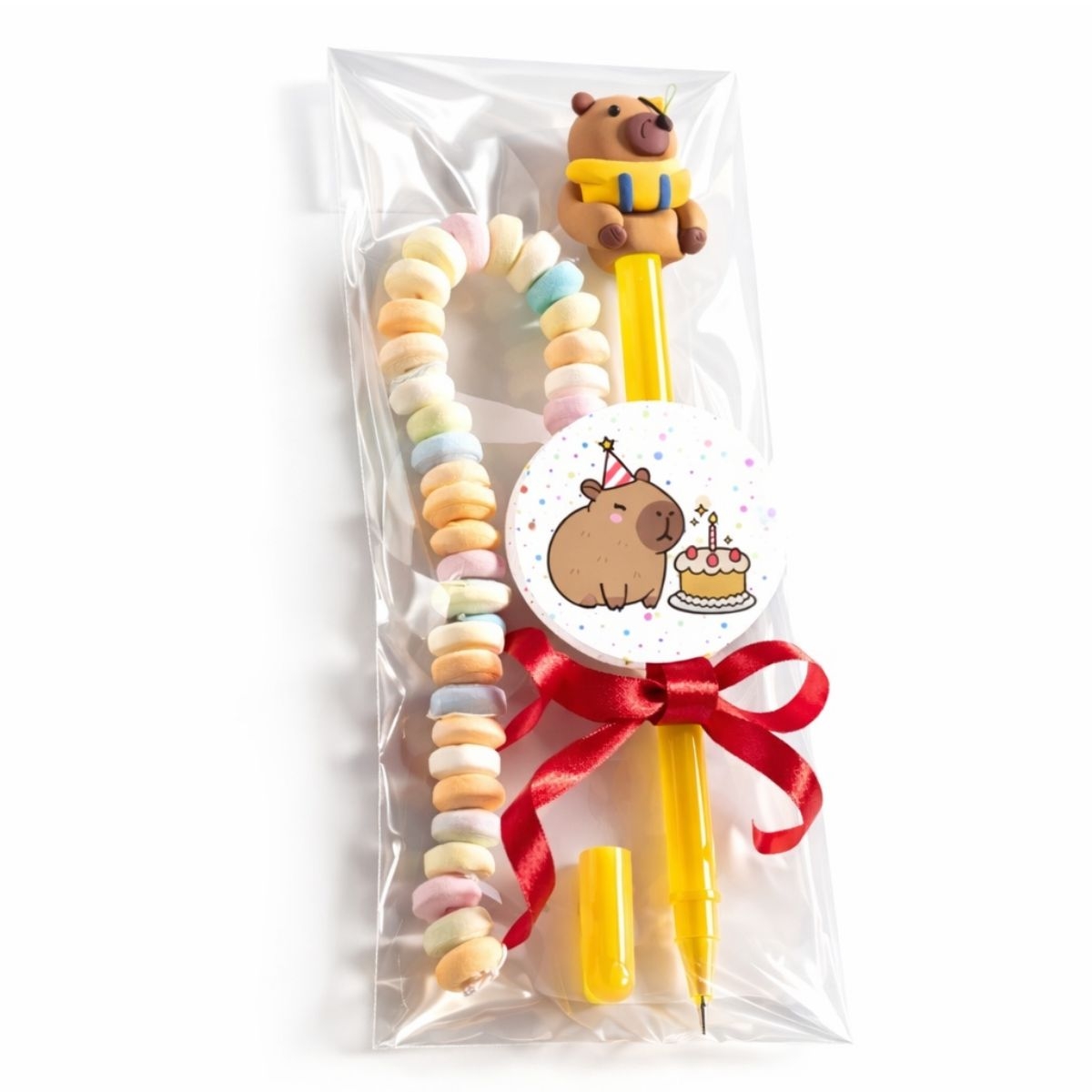 Capybara-sticker en een lintje. Alles wordt los geleverd incl. blokbodemzak zodat je het zelf makkelijk kunt inpakken. Liever kant-en-klaar? Voor een kleine meerprijs van €0,40 pakken wij het feestelijk voor je in (houd dan rekening met 2–3 werkdagen extra levertijd). Perfect als