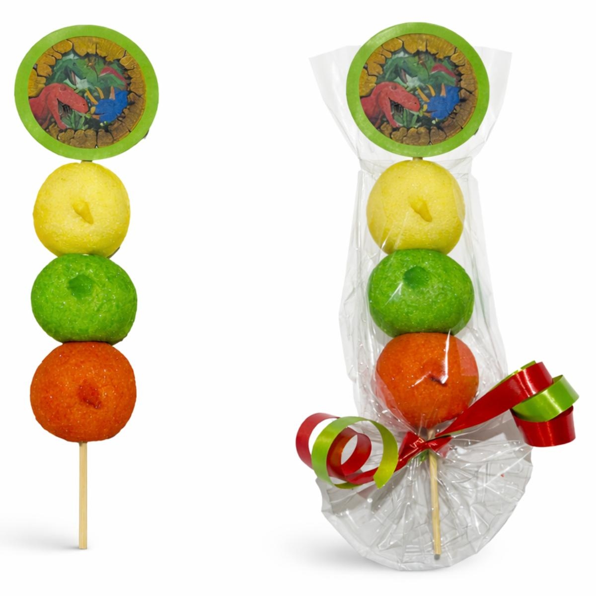 - Spekspies met 3 spekbollen, spekbol rood, spekbol groen, spekbol geel, sateprikker 18 cm en plaatje. Zelf sticker op het kaartje plakken en het kaartje aan het stokje bevestigen.