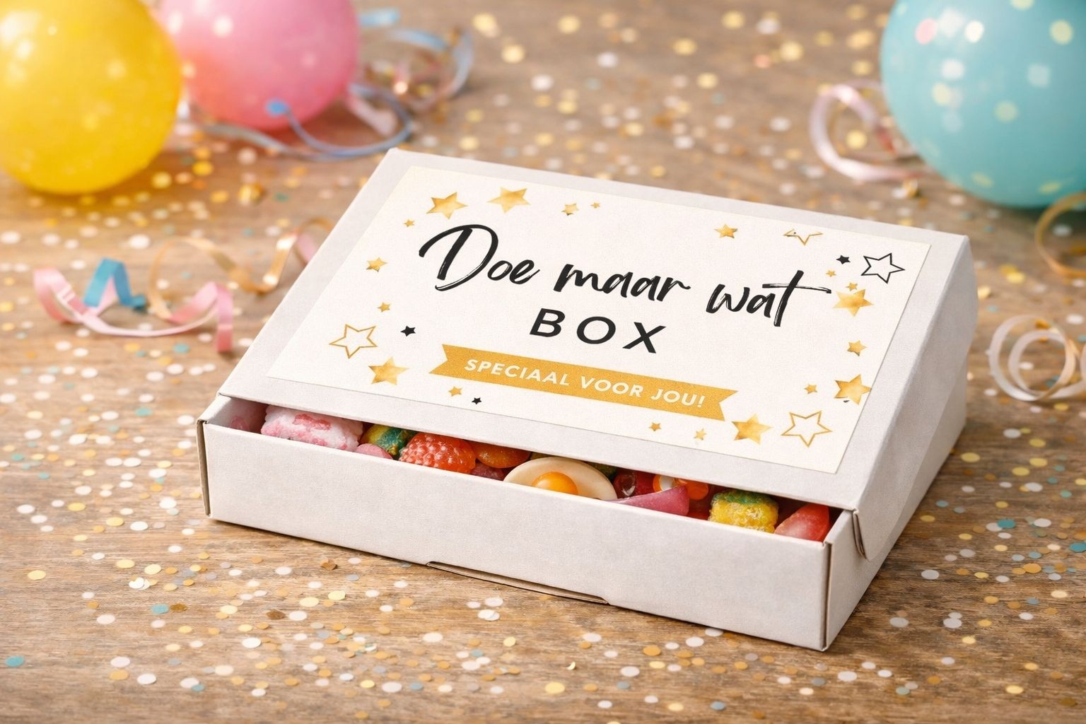 De Doe Maar Wat Box is een klein snoepcadeau met 250 gram verrassings snoepmix, verpakt in een mooi brievenbusdoosje. Perfect als verjaardagscadeau, opkikker of zomaar attent cadeautje.