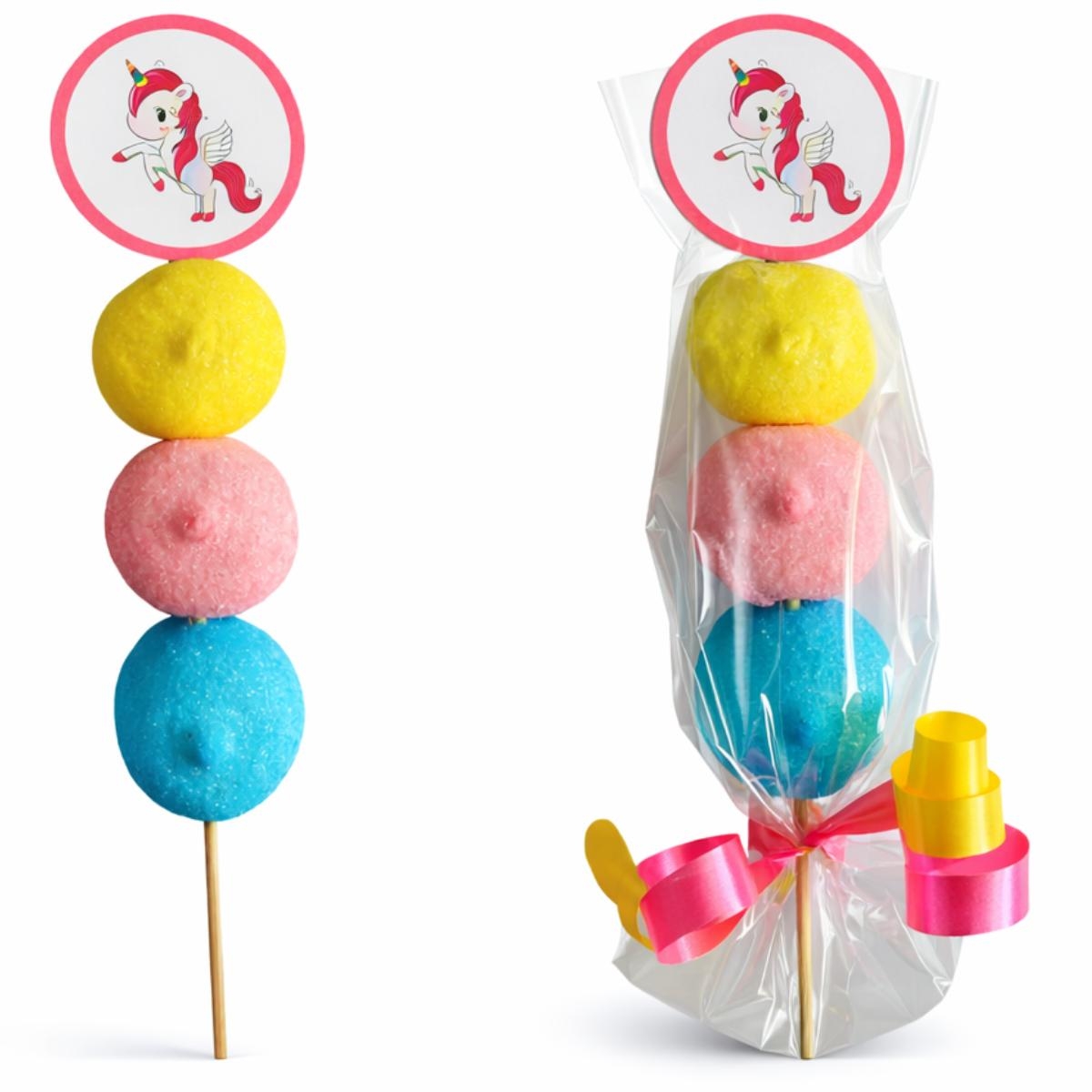 - Spekspies met 3 spekbollen, spekbol blauw, spekbol roze, spekbol geel, sateprikker 18 cm en plaatje.Zelf sticker op het kaartje plakken en het kaartje aan het stokje bevestigen.