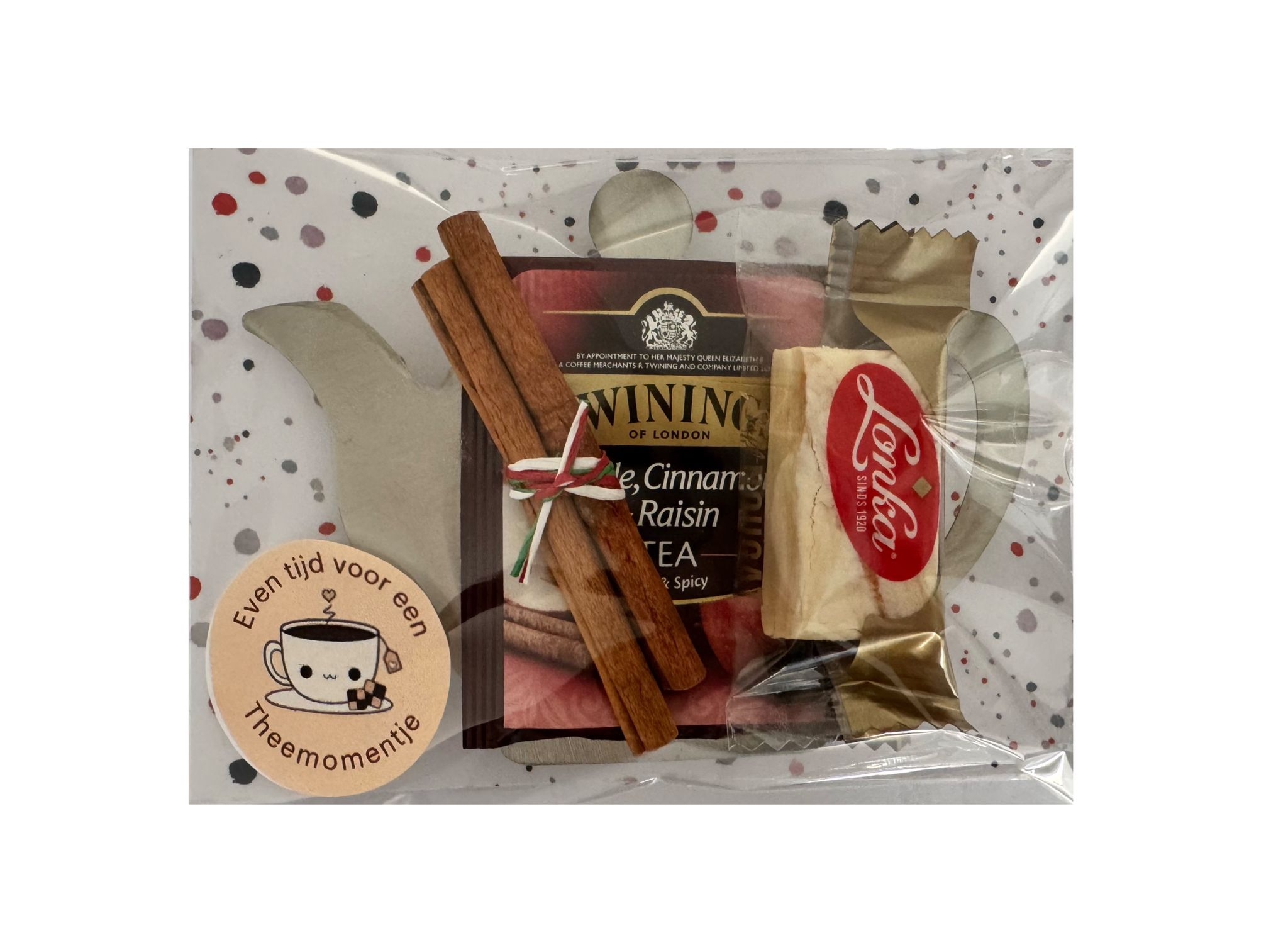 Even tijd voor een theemomentje! Dit stijlvolle theecadeautje bevat een kaart met een RVS theetip in de vorm van een theepotje, een zakje Twining’s thee Cinnamon Raisin, een stukje Lonka nougat en een paar geurige kaneelstokjes. Alles is prachtig verpakt in cellofaan met een sticker “Even tijd voor een Theemomentje”. Perfect als klein cadeautje, bedankje of verwenmoment voor jezelf.