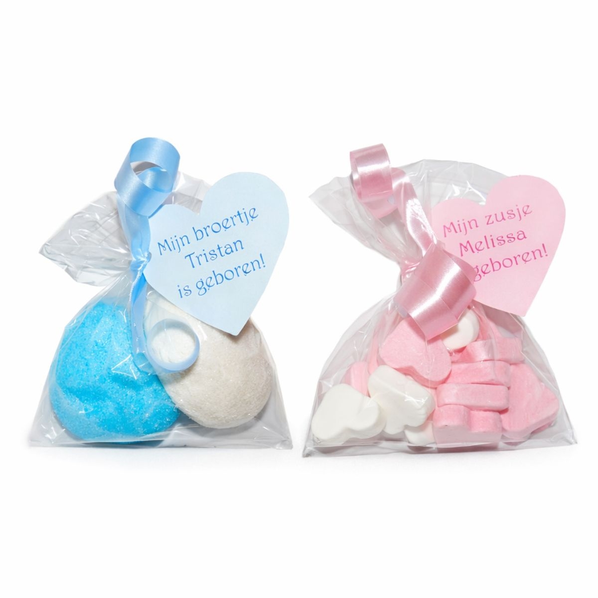 - Bij deze traktatie krijg je: zakjes, lintjes, kaartje hart met tekst en 20 gram vruchtenhartjes of 2 spekbollen
