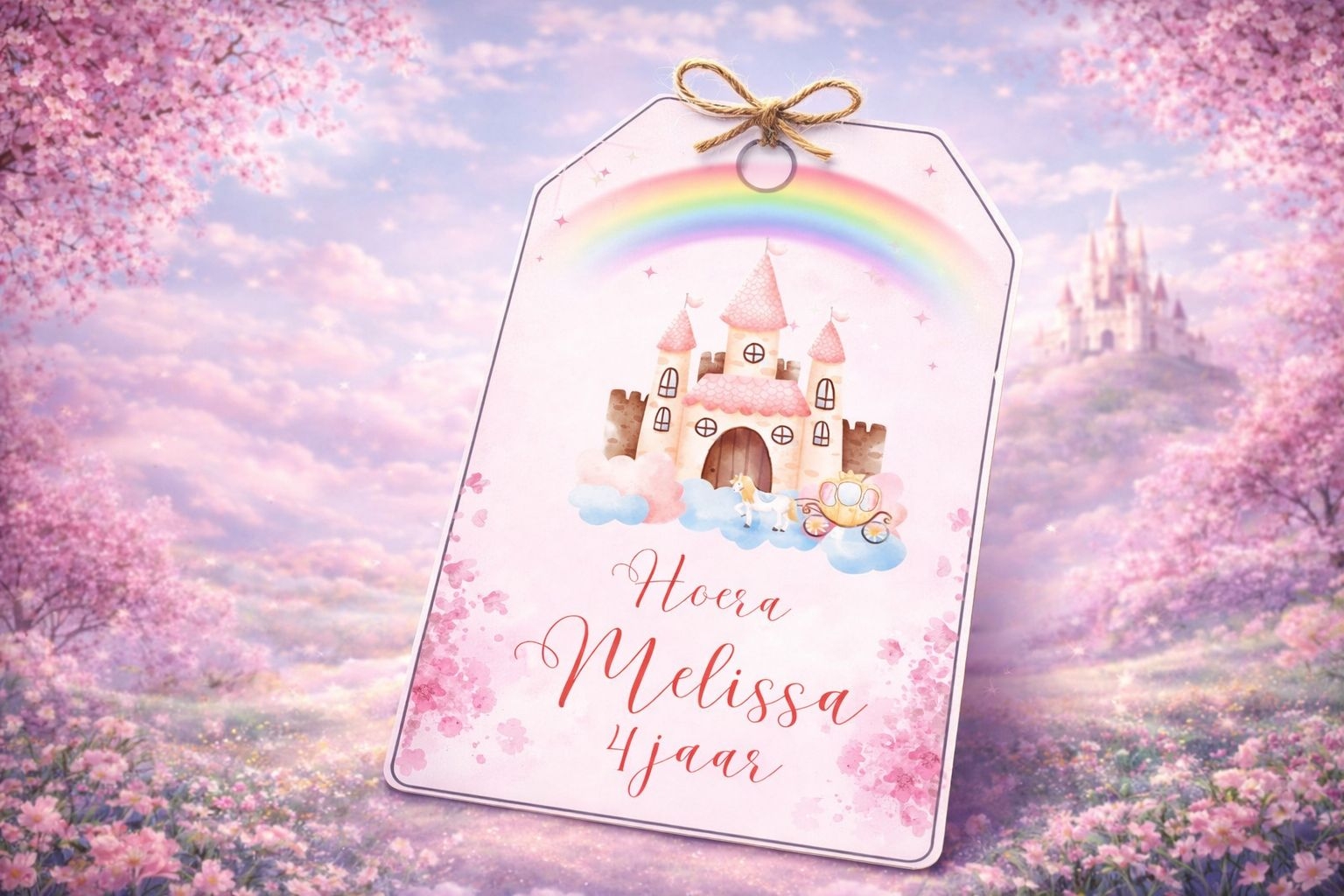 Het zachte ontwerp met kasteel, regenboog en romantische details zorgt voor een lieve en magische uitstraling. Ideaal om te bevestigen aan snoepzakjes, uitdeelcadeautjes, bekertjes of andere traktaties.
