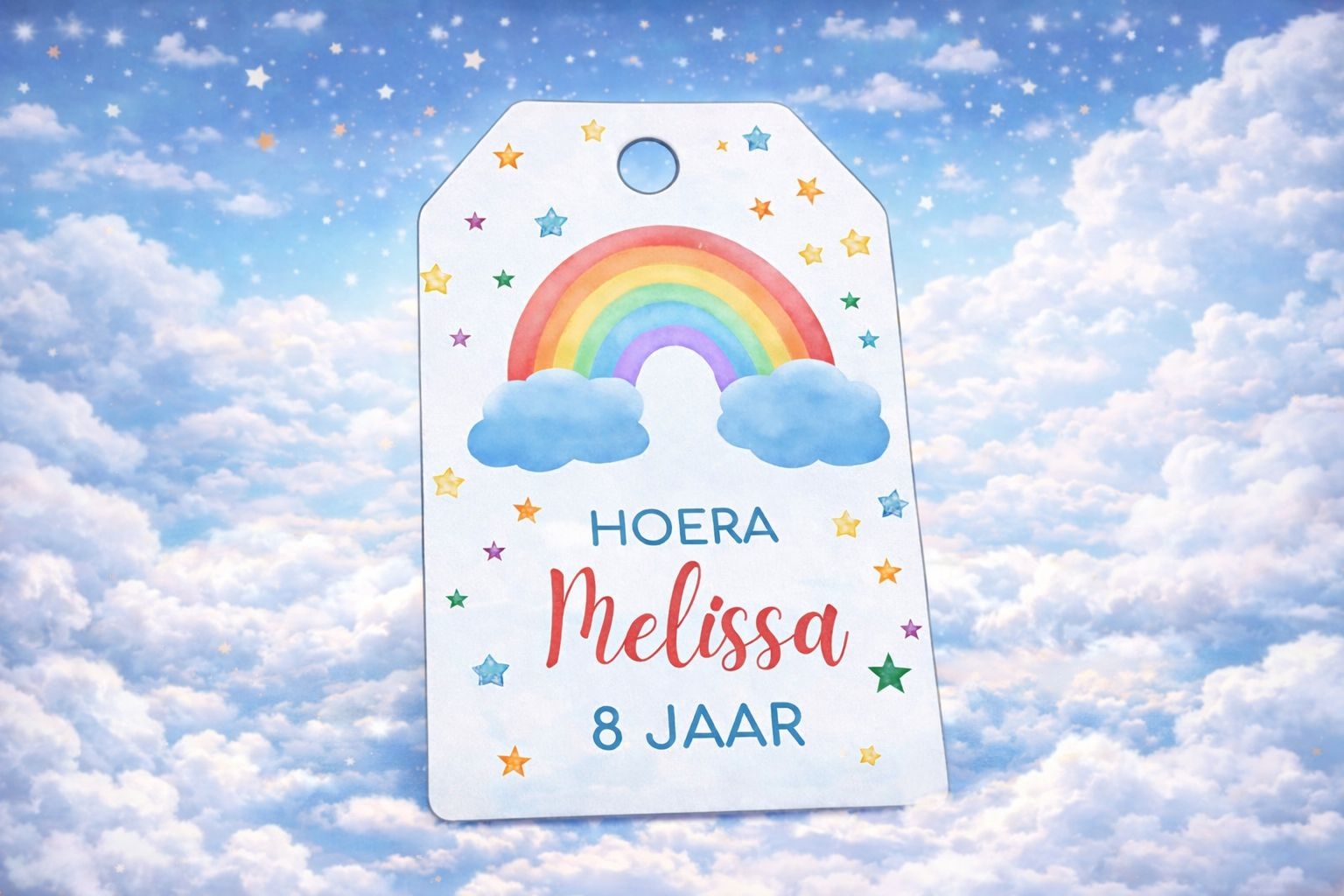 Het zachte ontwerp met regenboog, wolkjes en kleurrijke sterretjes zorgt voor een lieve en feestelijke uitstraling. Ideaal om te bevestigen aan snoepzakjes, uitdeelcadeautjes, bekertjes of andere traktaties.