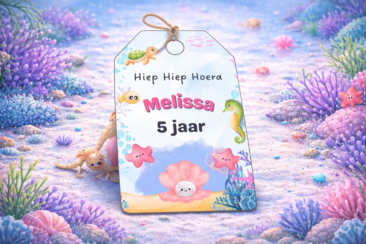 Het vrolijke onderwaterdesign met zeepaardje, schildpad, visjes en zeester zorgt voor een speelse en feestelijke uitstraling. Ideaal om te bevestigen aan snoepzakjes, uitdeelcadeautjes, bekertjes of andere traktaties.