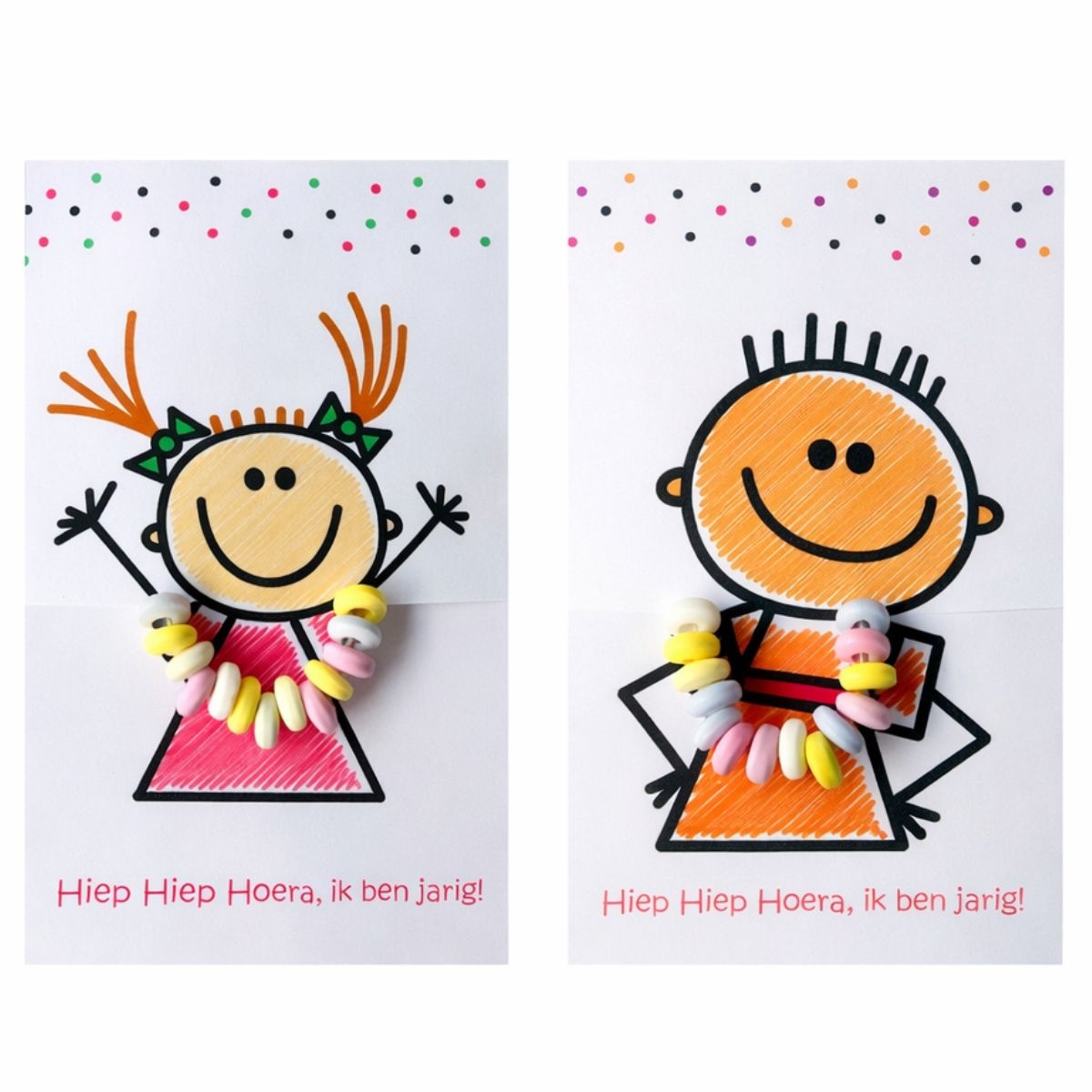 - Bij deze traktatie is het alleen mogelijk het zelf te maken. Je krijgt het volgende geleverd: kaart a6 jongen of meisje met poppetje en tekst Hiep Hiep Hoera, blauwe of roze a6 kaart voor de achterkant, snoepketting en A6 cellofaanzakje