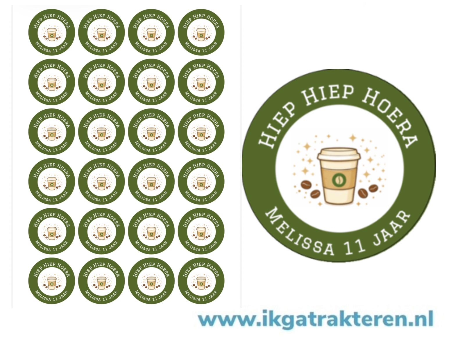 Maak je traktatie in één keer extra persoonlijk met deze ronde koffiebeker-stijl stickers. Je bestelt een vel met 24 papieren stickers (4 cm doorsnee) en jij geeft zelf de naam en leeftijd door. Super leuk voor een kinderfeestje, schooltraktatie of een koffie-thema traktatie.