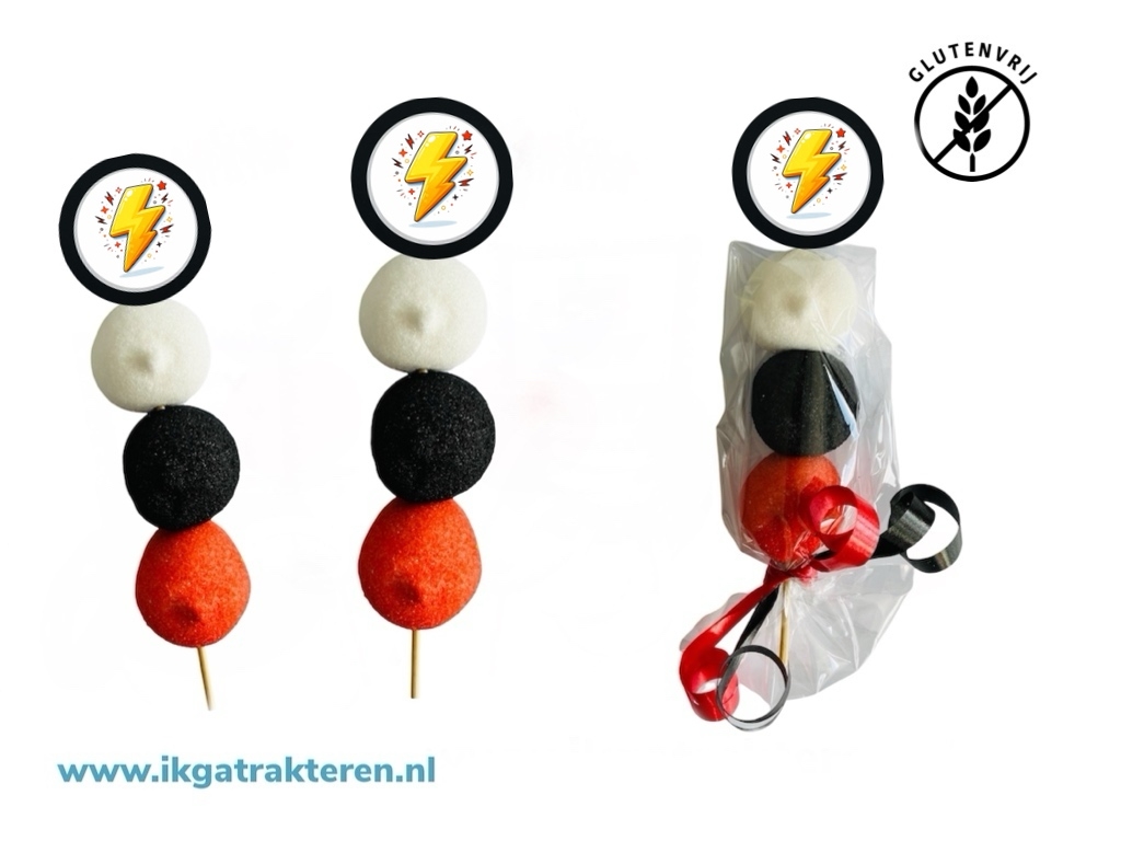 Deze vrolijke Monsters Vangen Spekspies is ideaal voor een kleurrijke en stoere traktatie. Je ontvangt drie spekbollen in herkenbare rood–wit–gele kleuren, een stevige satéprikker en een kaartje waarop je zelf de sticker plakt. Alles wordt los geleverd, zodat je de spies eenvoudig zelf kunt maken en naar wens kunt verpakken.