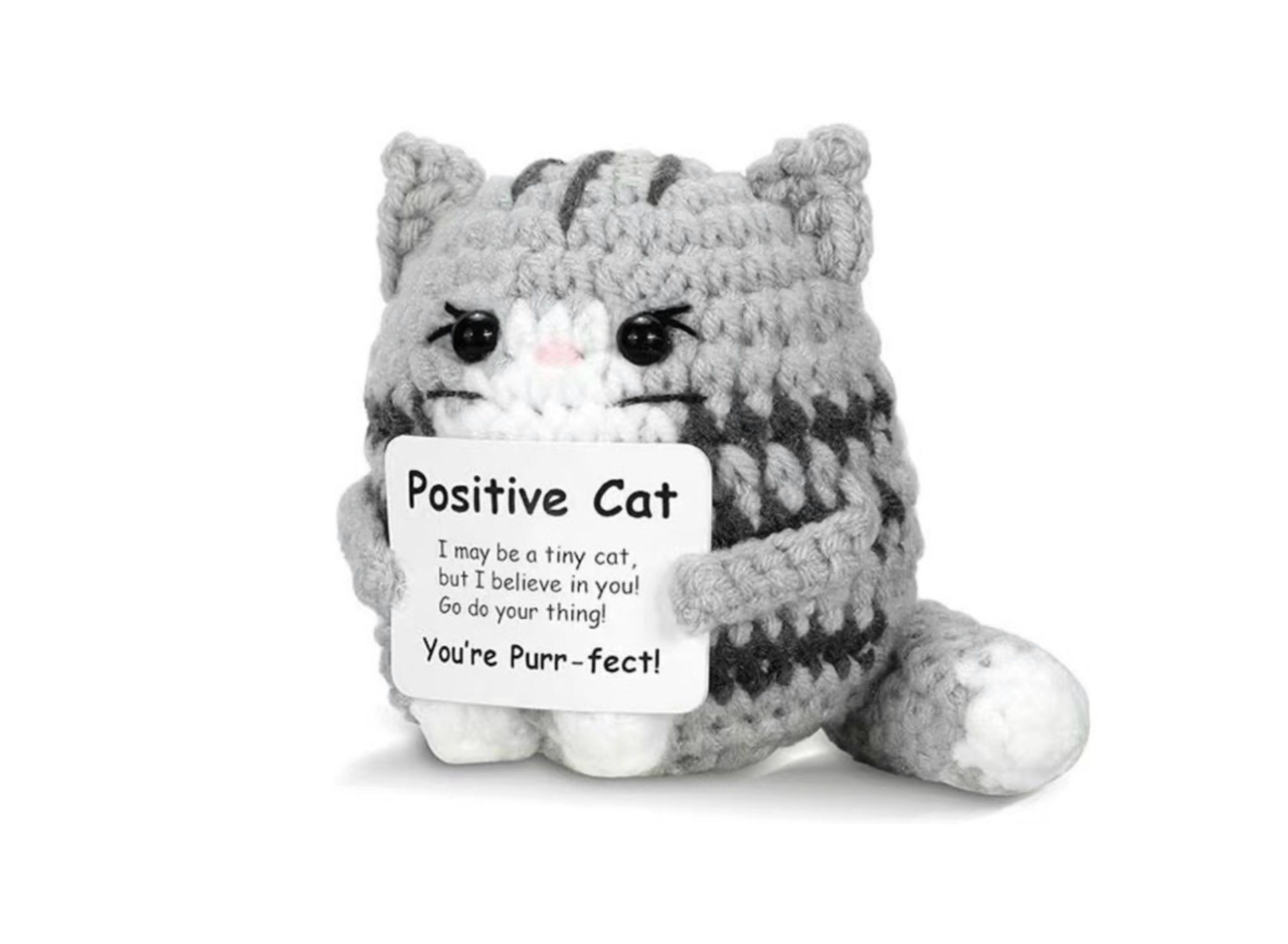 Op dit gehaakte geluksknuffeltje staat de volgende tekst: "Positive Cat. I may be a Tiny cat, but i believe in you! Go do your thing! You're Purr-fect"