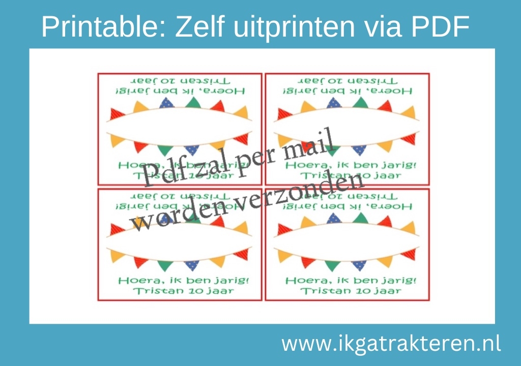 Wil je graag zelf jouw traktatie labels printen? Dat kan supergoed met onze printables. Je geeft ons door welke tekst je op de labels wilt hebben en wij zorgen ervoor dat jij de printable met persoonlijke tekst als pdf bestand gemaild krijgt. Je kunt deze dan zelf zo vaak uit printen als je wilt. Jij kunt er dan jouw eigen snoepzakje mee maken.