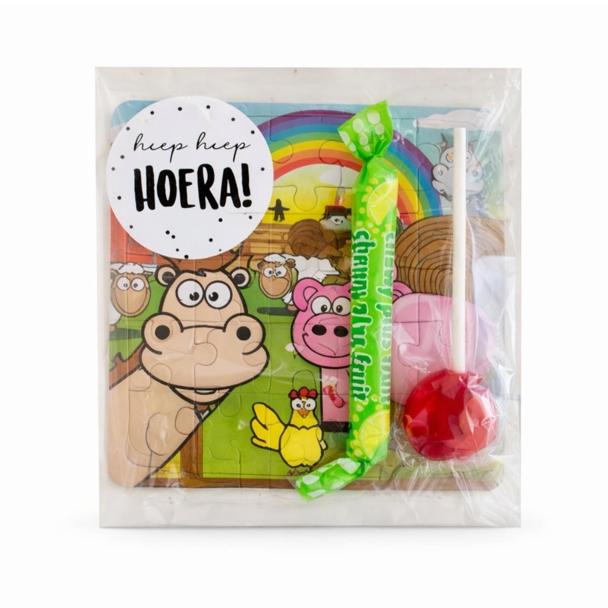 In deze traktatie zit een kleine kartonnen kinderpuzzel met dunne stukjes. Het is een eenvoudig puzzeltje dat vooral bedoeld is als leuk extraatje bij het uitdelen. Geschikt vanaf circa 4/5 jaar.