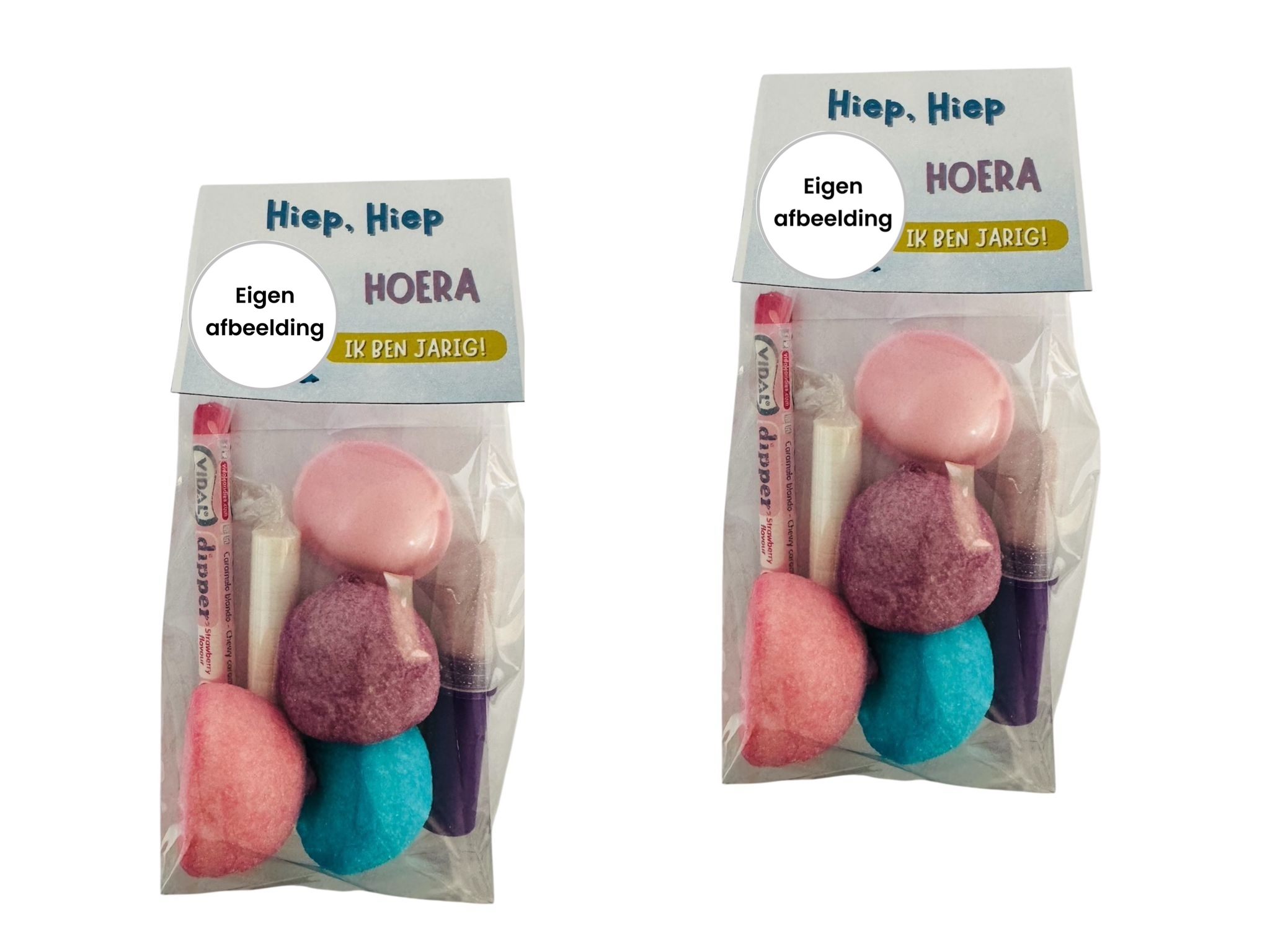 Het zakje is zorgvuldig samengesteld en bevat een mix van zoet en zuur snoep. Het kaartje bovenop kun je personaliseren door zelf een afbeelding, foto of illustratie aan te leveren. Zo maak je eenvoudig een unieke en persoonlijke traktatie voor school.
