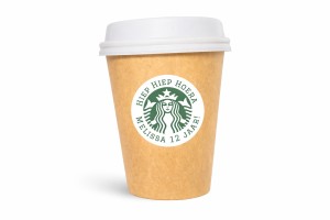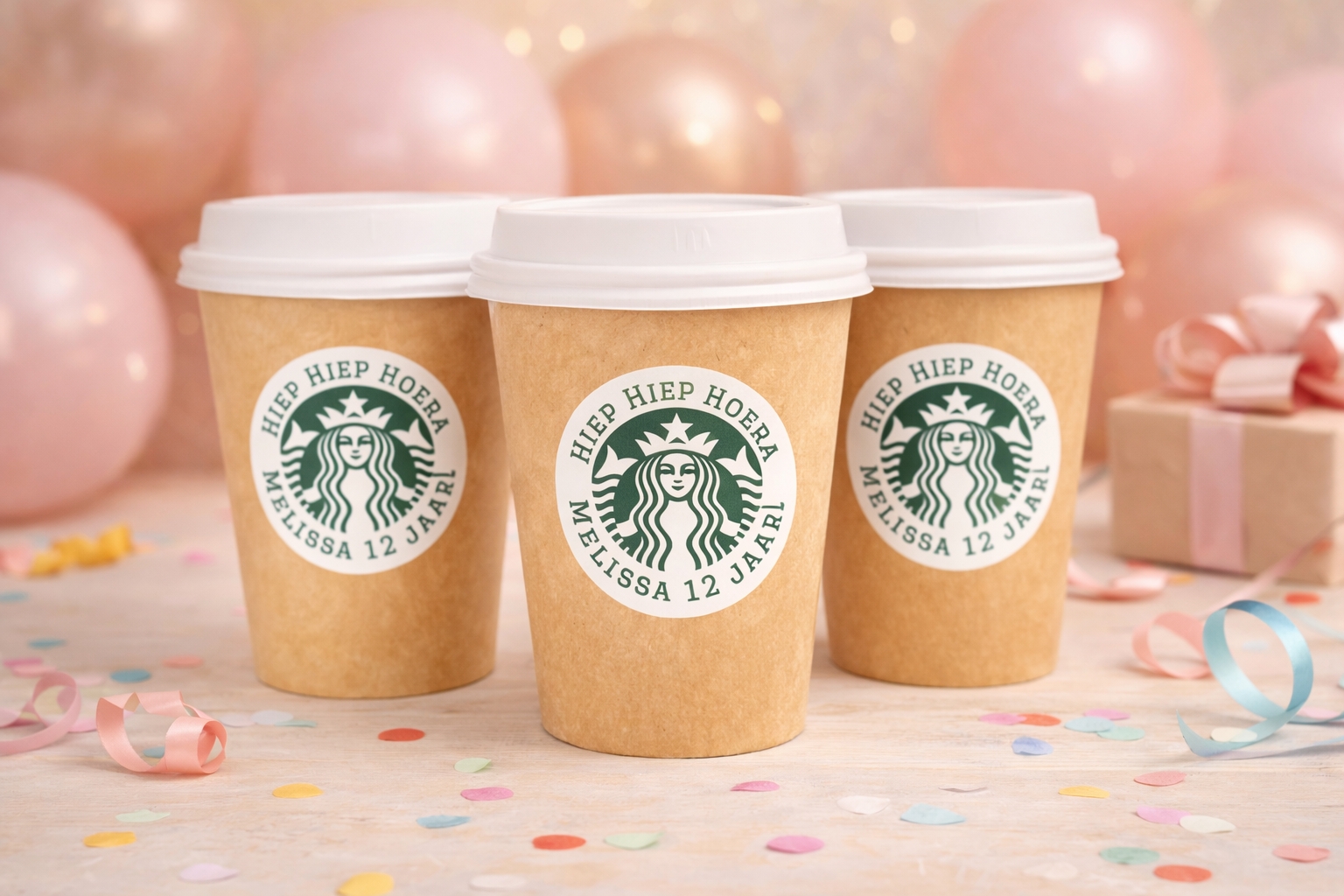 - beker van 230 ml met witte deksel en standaard sticker met de tekst hiep hiep hoera