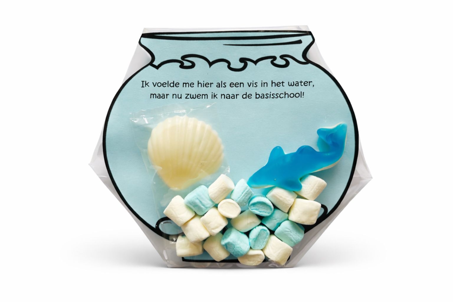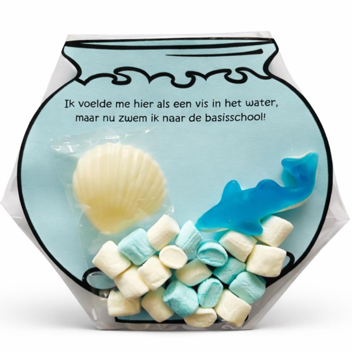 - Werkwijze: je knipt de viskom uit het papier en doet deze helemaal in 1 hoek in het a5 zakje. Vervolgens draai je het zakje om en vouw je de puntjes onderin naar achter en plakt deze vast met een plakbandje, de spekjes blijven dan mooier onderin zitten. Je doet 10 gram mini marsmallows per zakje onderin de viskom, de visjes erbij in en de likschelp en jouw trakatie is klaar :)