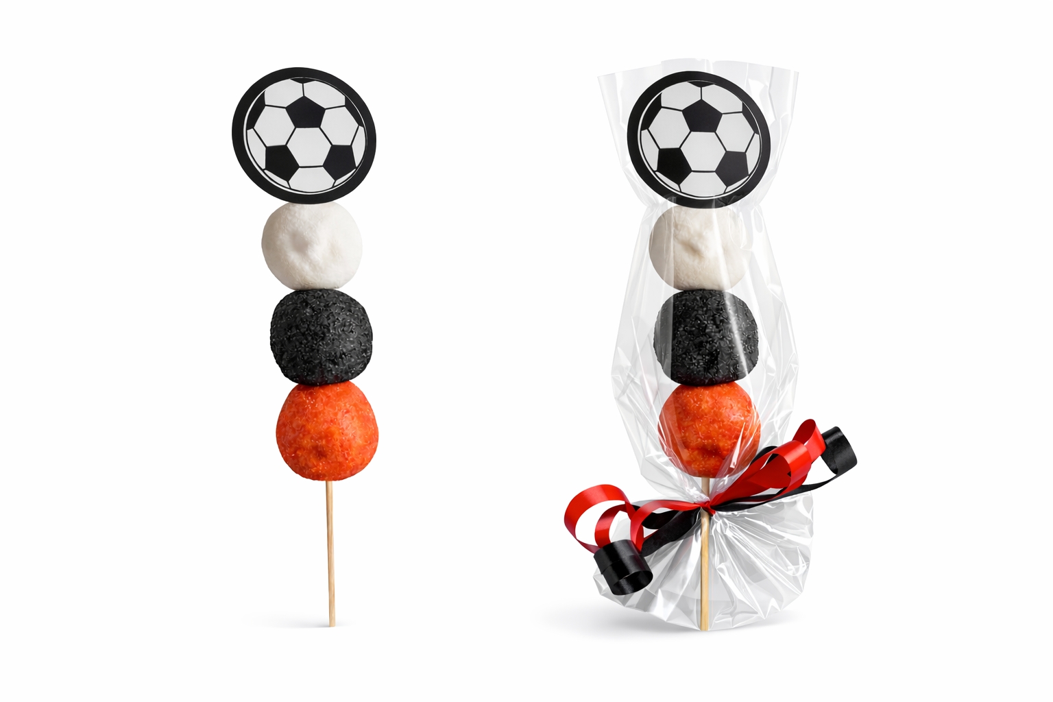 Maak zelf een stoere voetbal traktatie met deze rood-witte spekspies. Perfect voor kleine voetbalfans en geschikt voor supporters van onder andere Ajax, Feyenoord of PSV. Dankzij de algemene voetbal topper is deze traktatie breed inzetbaar.