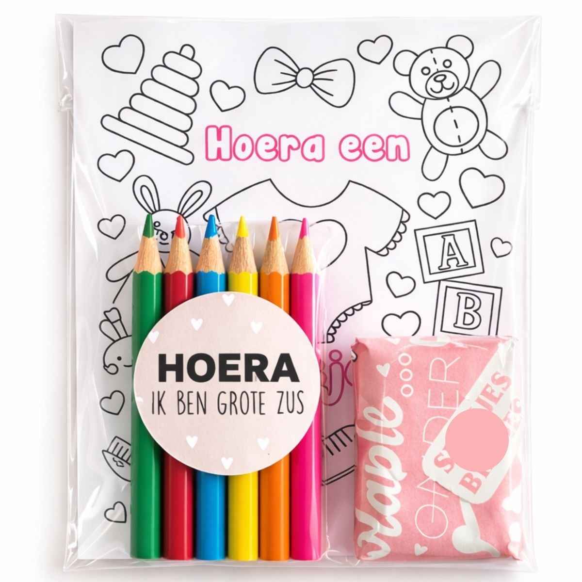 - kleurplaatje 160 gram Hoera een zusje met baby afbeeldingen erop