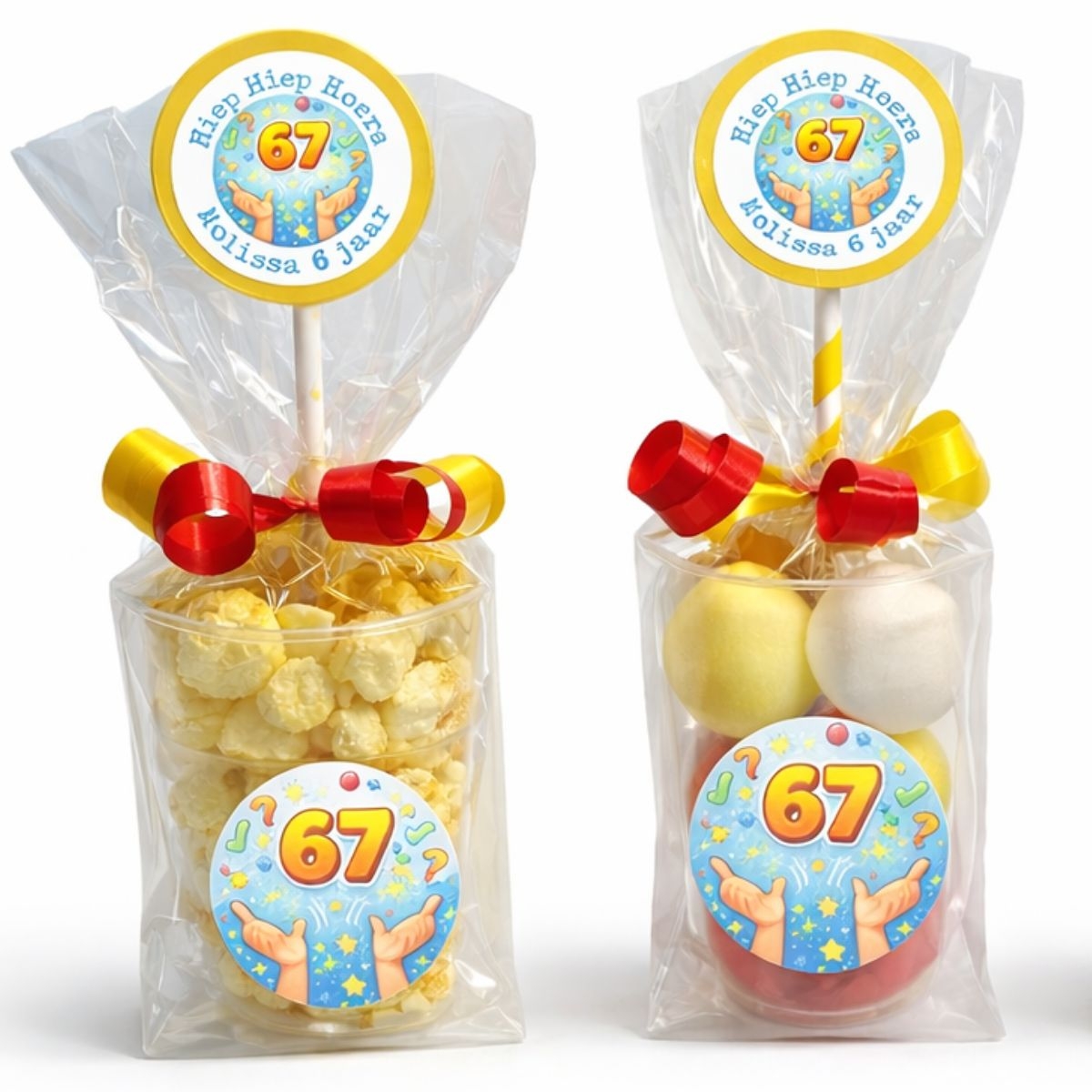 Eenhoorn Beker Hoorn Traktatie Zelfmaak pakketje bestaat uit; beker wit, blanco puntzak, 35 gram mini marshmallows, 3 krullintjes en 1 set oogjes (deze dienen nog uitgeknipt te worden) let op dit betreft een zelfmaaktraktatie, je krijgt de bovenstaande artikelen los geleverd, zodat je de traktatie zelf kunt maken je snijdt bovenin de beker een klein kruisje met een scherp mes. Je verpakt 35 gram marshmallows in de puntzak en bindt de puntzak dicht met de 3 lintjes en krult ze. Je knipt de oogjes uit (als de wimpers te lastig zijn, kun je deze er ook af knippen en op de beker tekenen met een viltstift).